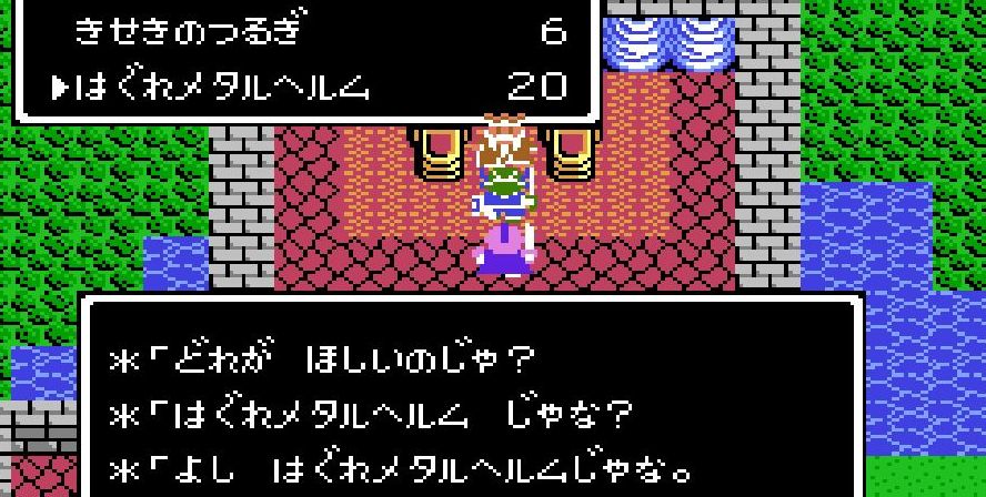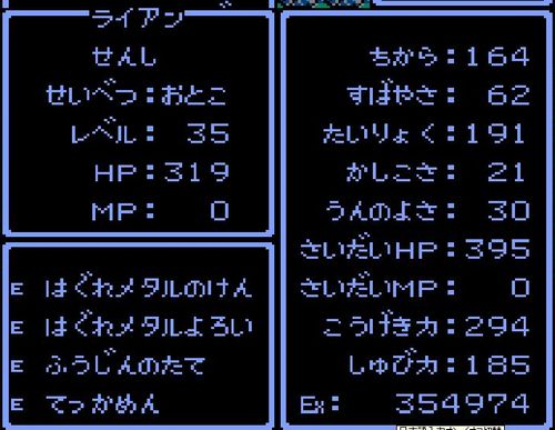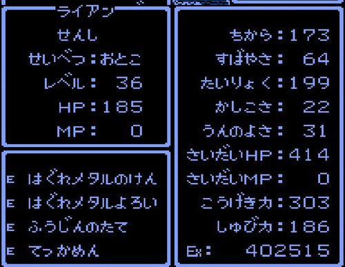 戦士・ライアンが「はぐれメタルヘルム」を装備。守備力が25ポイントアップ。