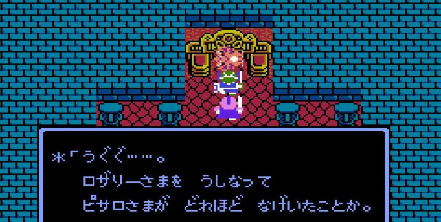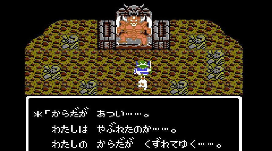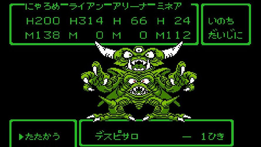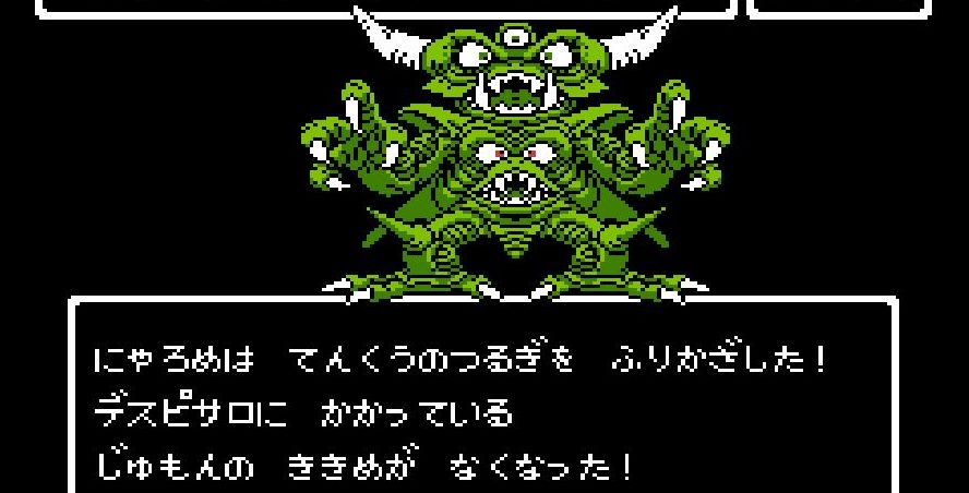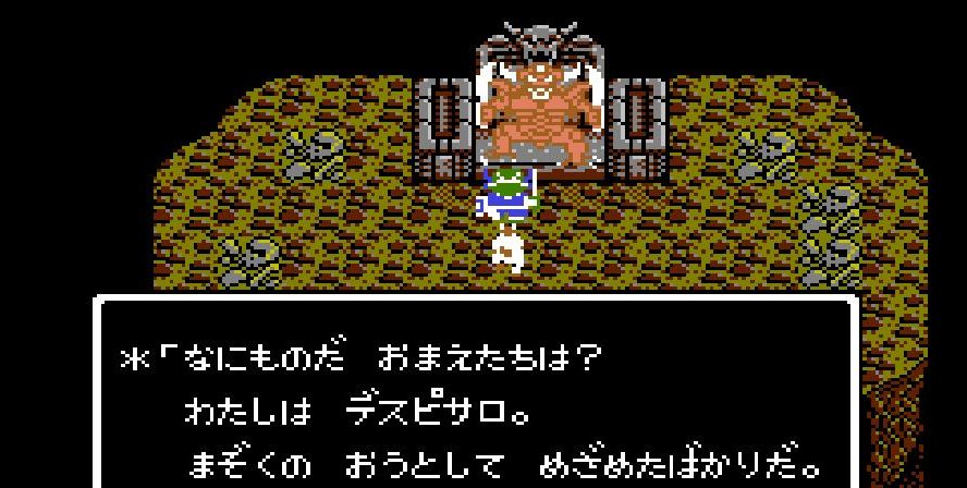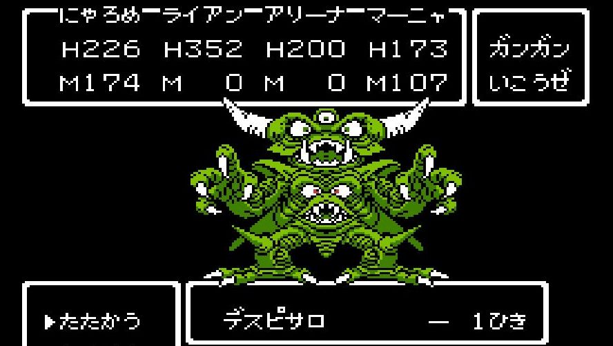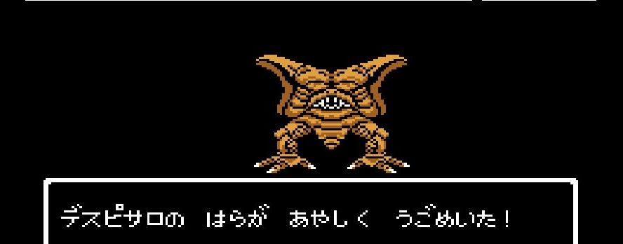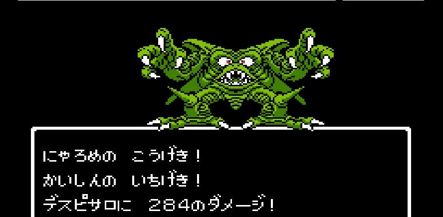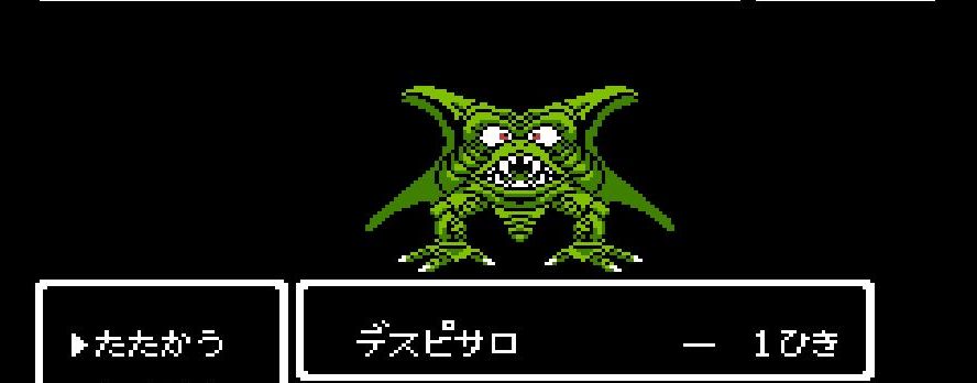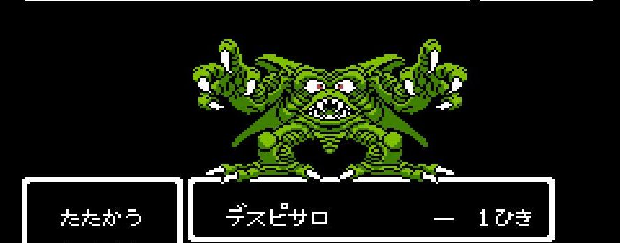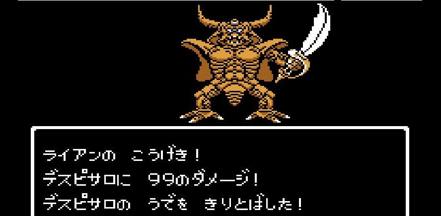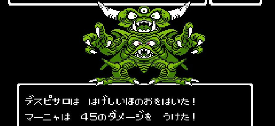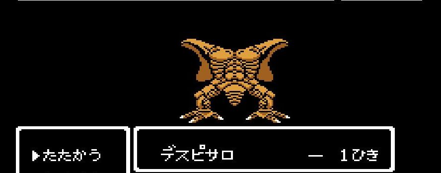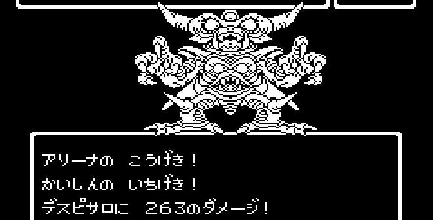 踊り子・マーニャの「メラゾーマ」、戦士・ライアンと姫・アリーナの打撃を加えていき、勇者・にゃろめが会心の一撃を出し、計871ポイントを与えたところで、デスピサロは「マホカンタ」(魔法を跳ね返す)を唱えてから変身を始める。