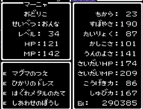 踊り子・マーニャがレベル33にアップ。呪文「メラゾーマ」を覚える。
